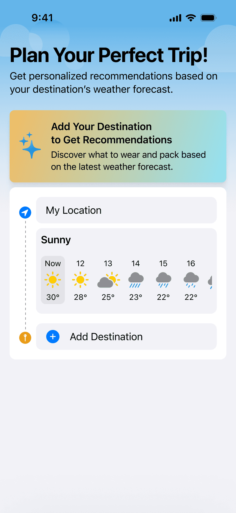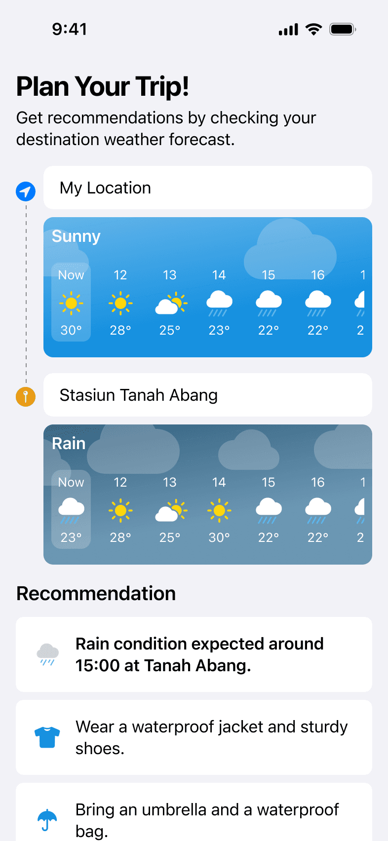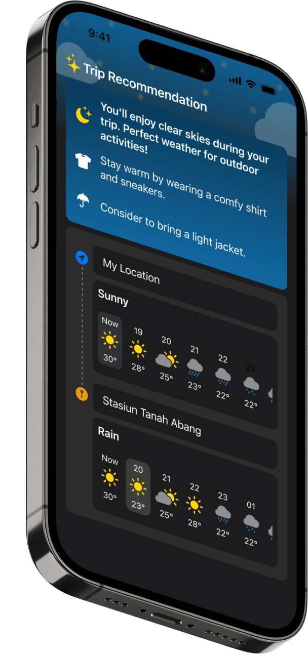 Wearther provides up-to-date weather information for your current location and your destination. By selecting your departure and arrival times, you instantly receive personalized recommendations on what to wear and what essentials to bring.