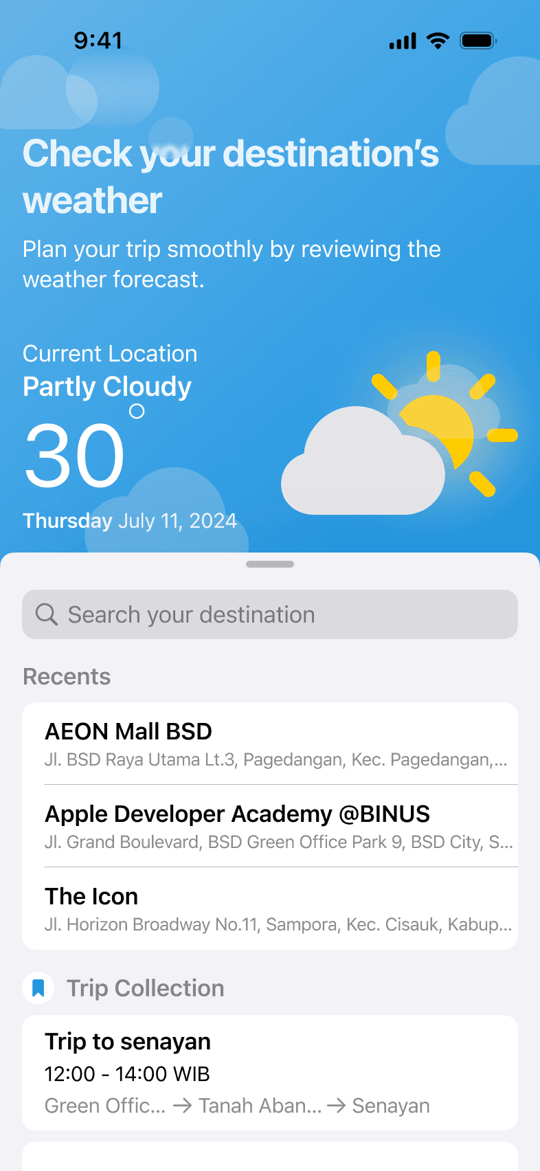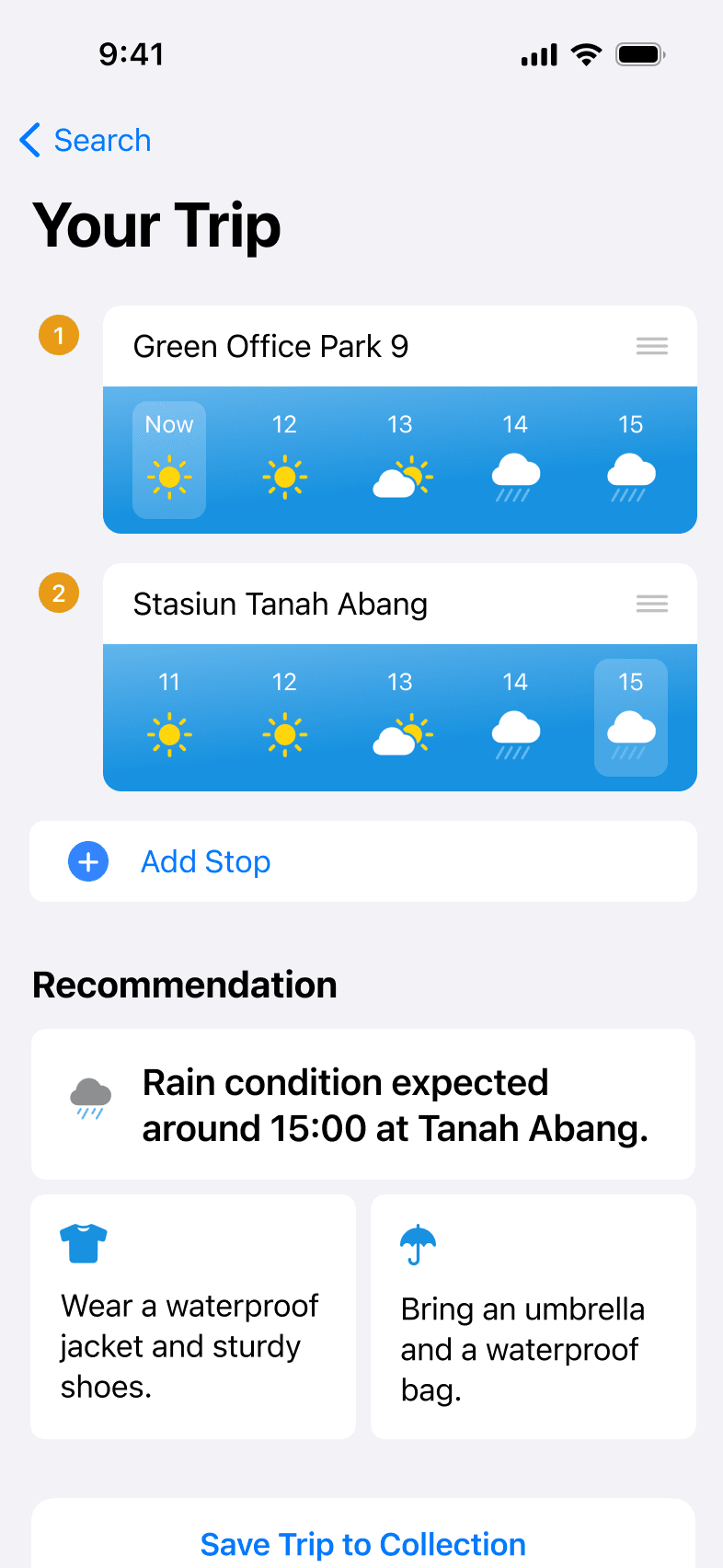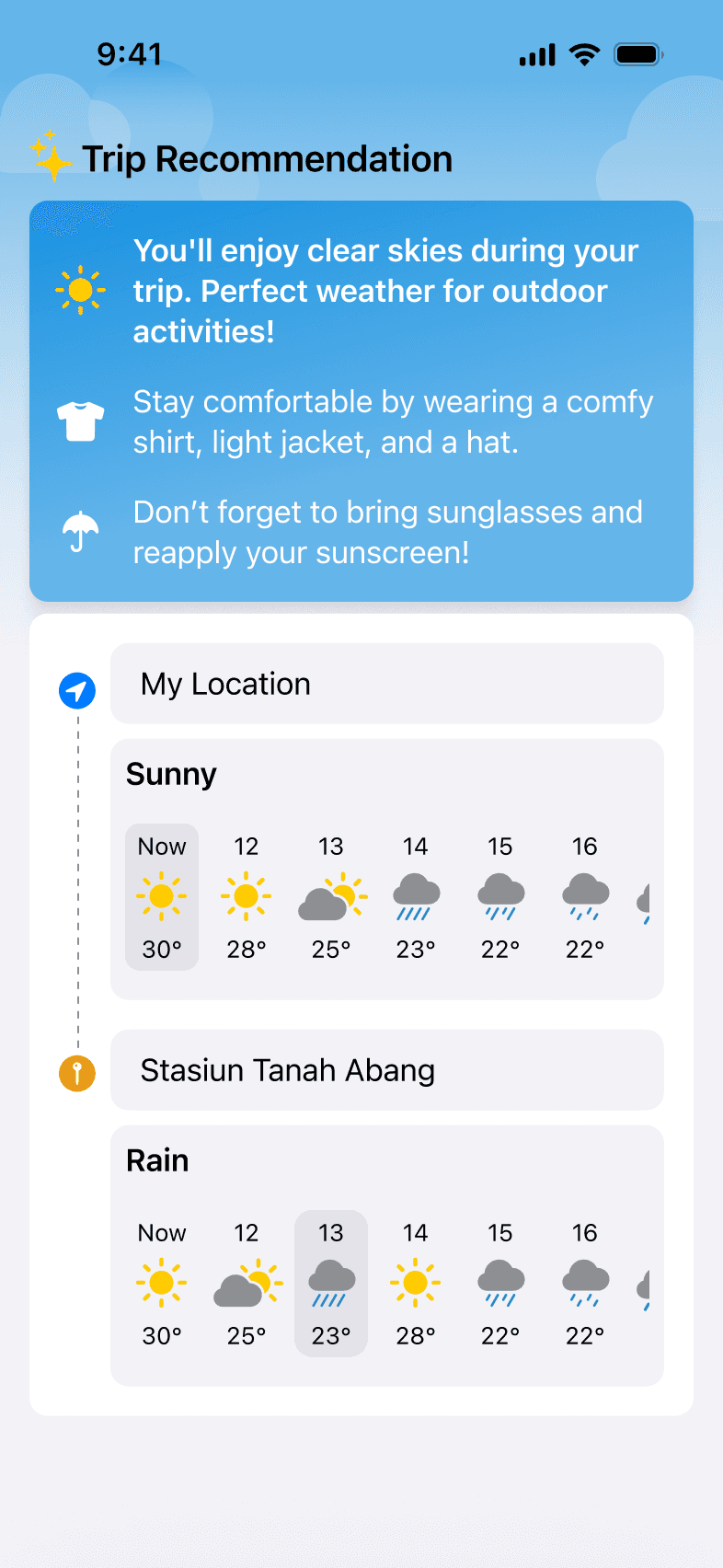 Wearther provides up-to-date weather information for your current location and your destination. By selecting your departure and arrival times, you instantly receive personalized recommendations on what to wear and what essentials to bring.